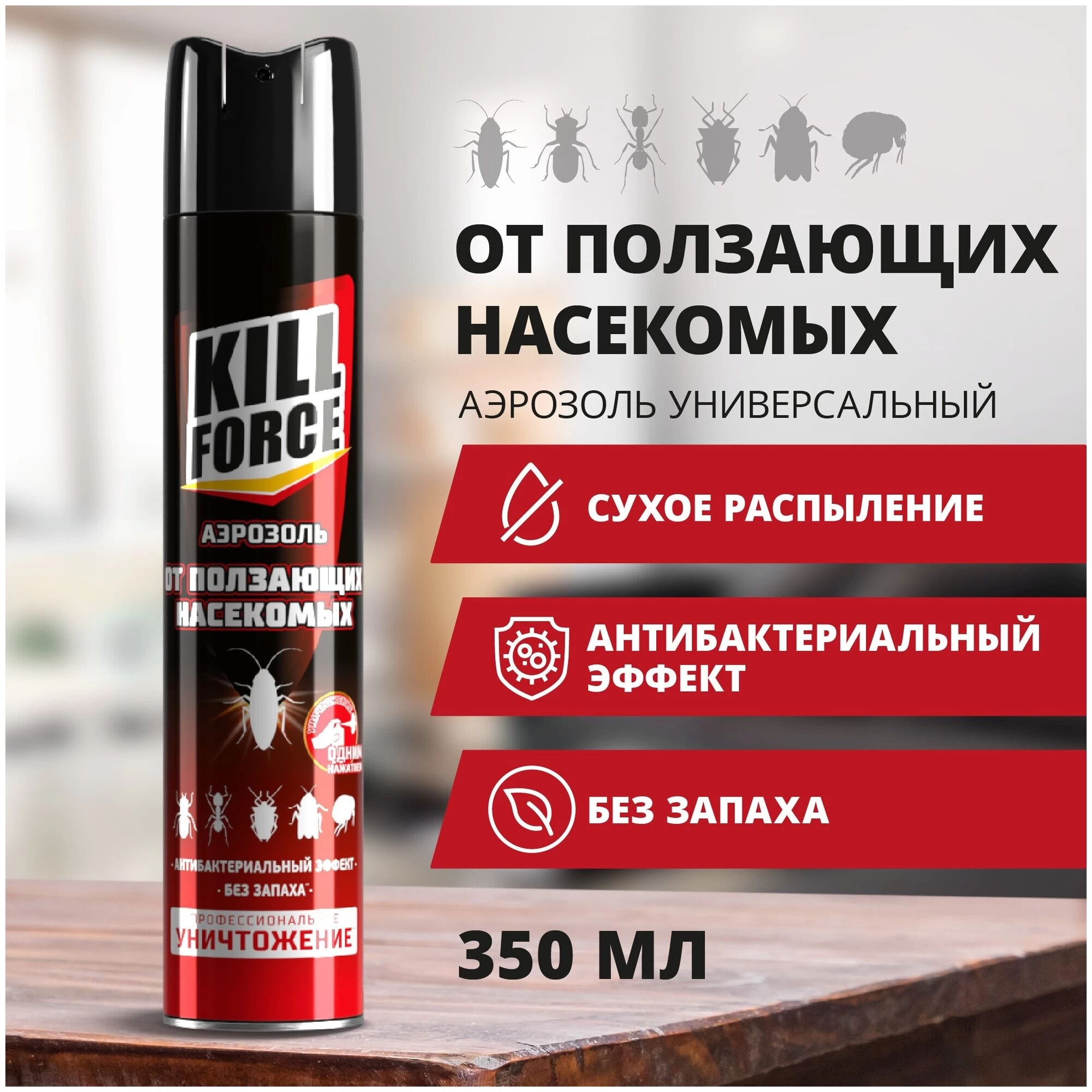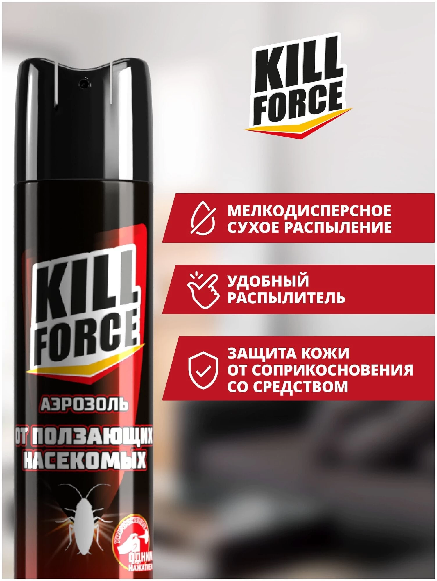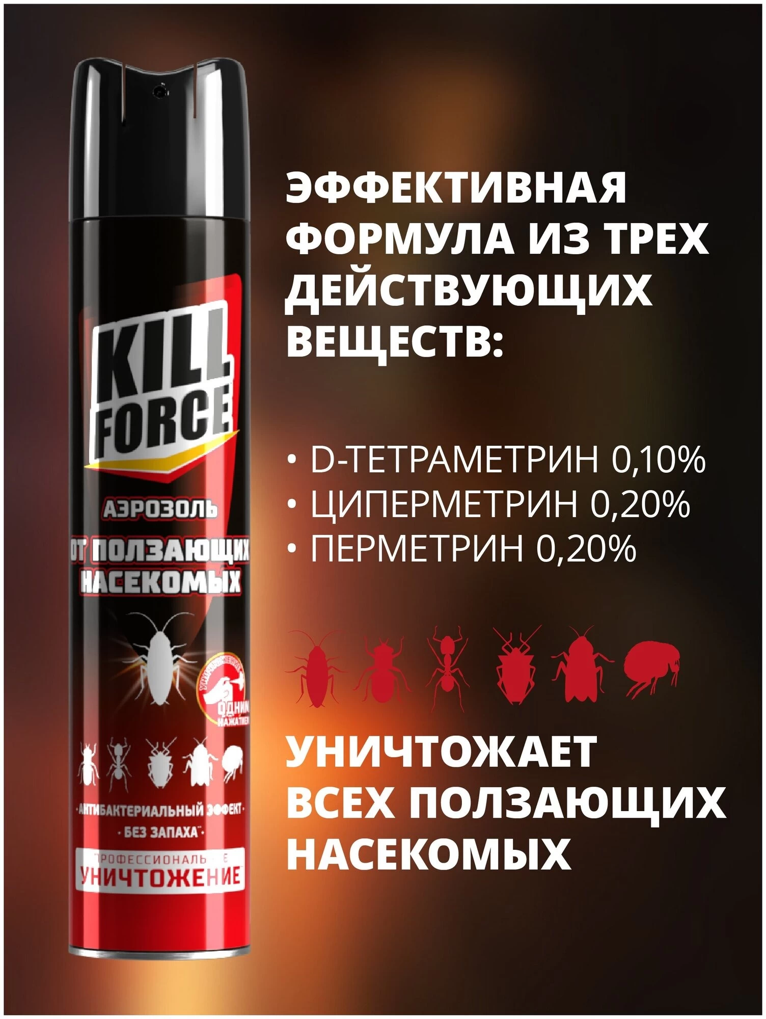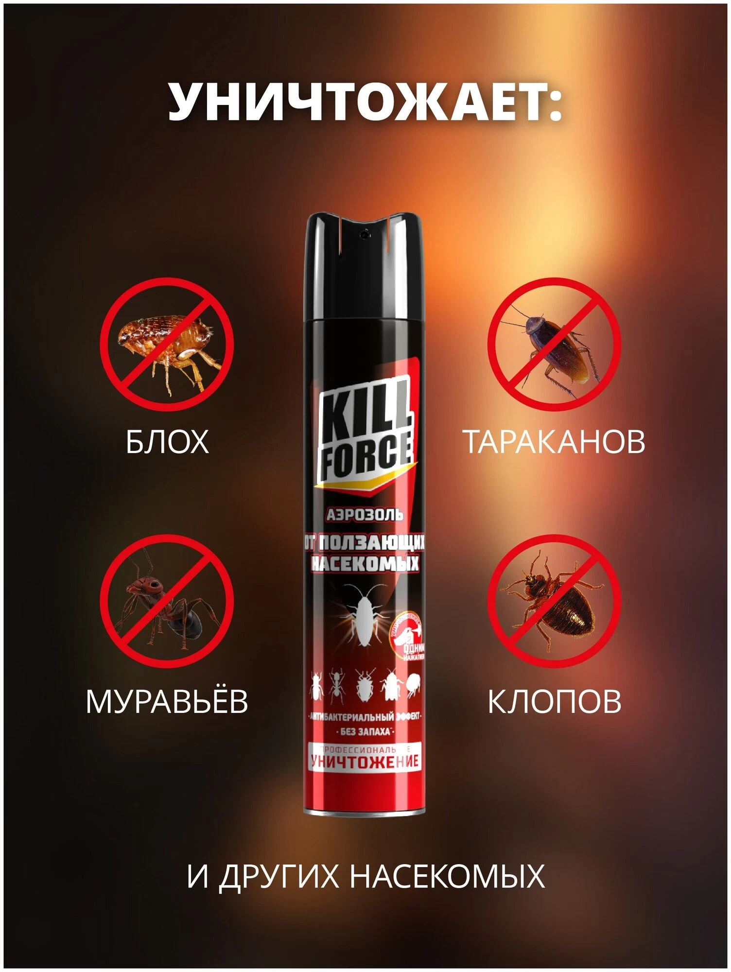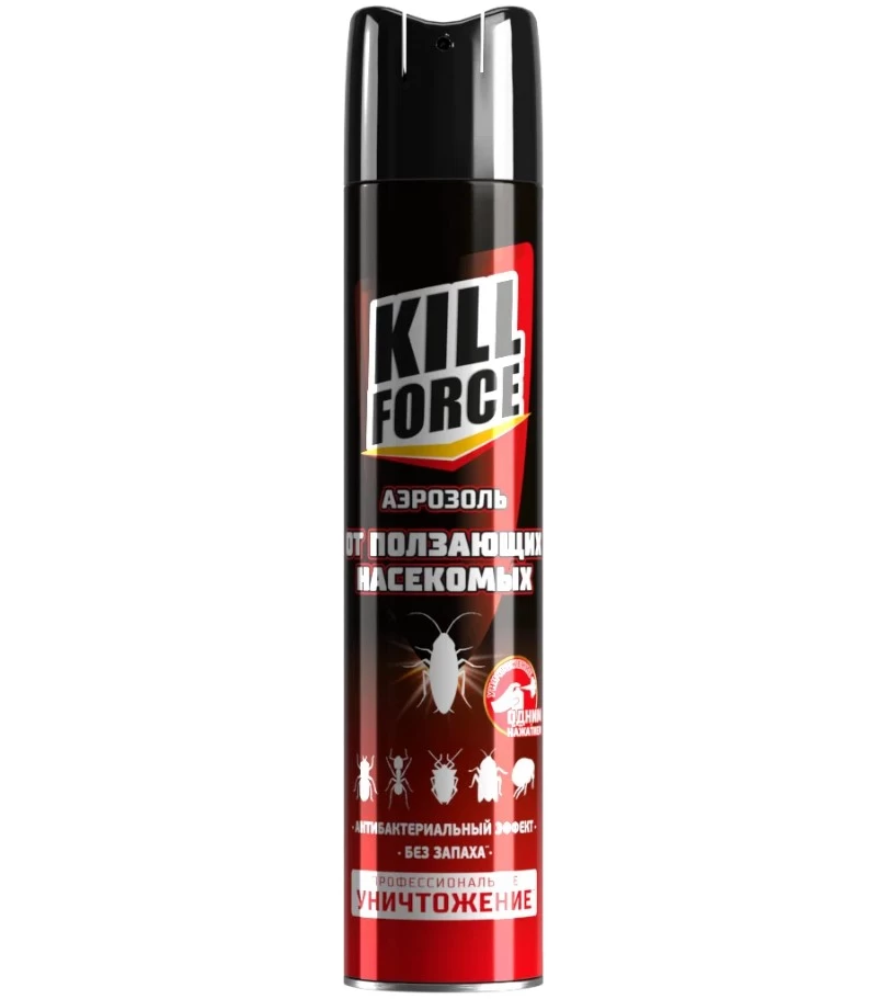 Gândaci, furnici, gândaci și alte insecte târâtoare - Kill force aerosol este o soluție eficientă în lupta împotriva tuturor insectelor târâtoare care trăiesc într-o cameră, casă, cabană, apartament, noptiere, birou, cantină, magazin, subsol, mansardă, depozit sau alte locuri unde există o cantitate mare de hrană și adăpost adecvat.
