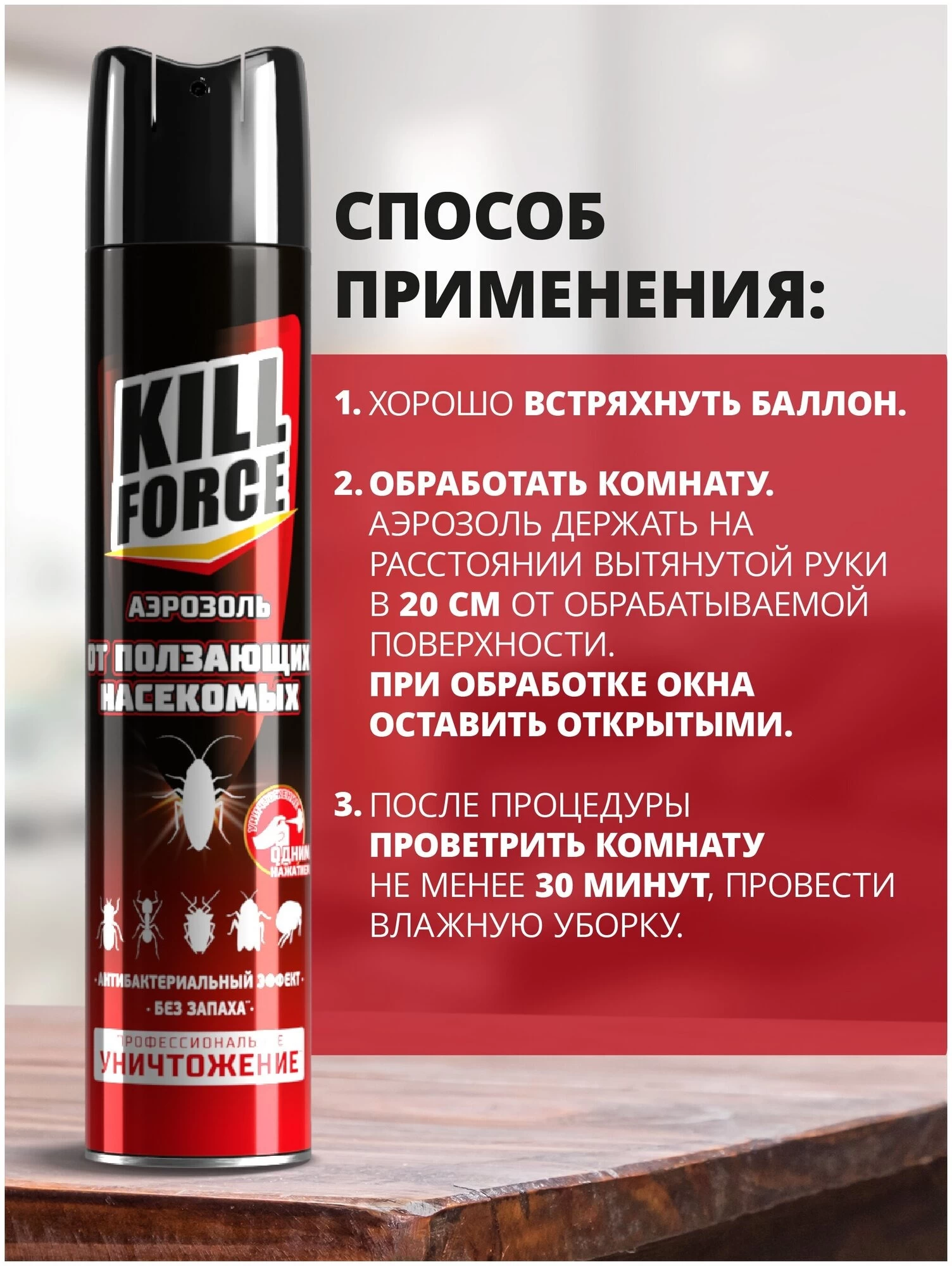 Pentru un efect optim, se recomandă tratarea întregii încăperi și a zonelor înconjurătoare pentru a preveni dezvoltarea rapidă a unei noi colonii de insecte. Aerosol din gândaci și furnici cu efect antibacterian Kill force face față eficient insectelor și nu lasă pete pe mobilă, pe podea și pe pereți, datorită tehnologiei de pulverizare uscată.