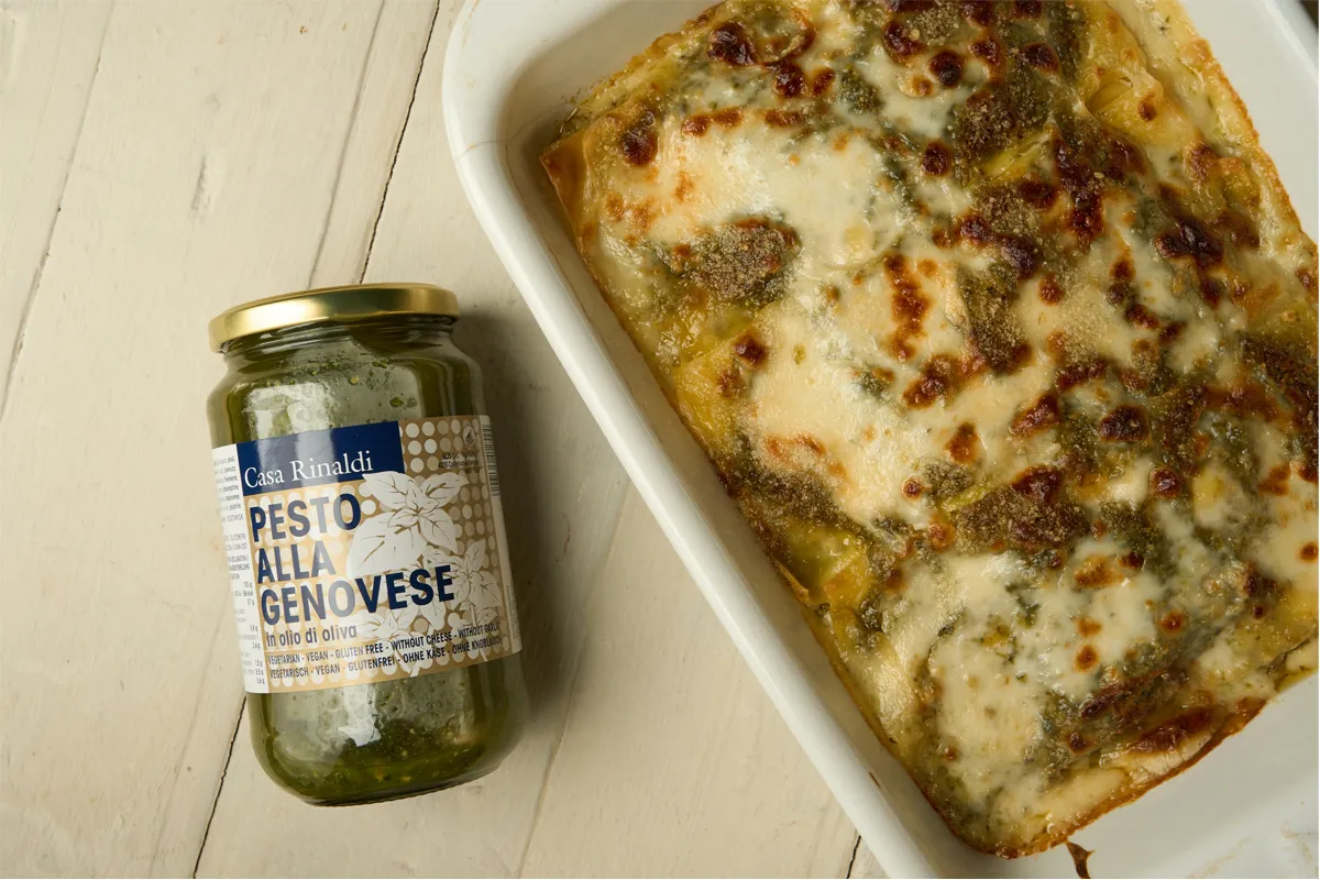 Sosul pesto Pesto alla Genovese de la Casa Rinaldi cu ulei de floarea-soarelui (Pesto alla Genovese in olio di girasole) este folosit pentru paste, lasagna, servit cu bruschete, biscuiți și pâine.
