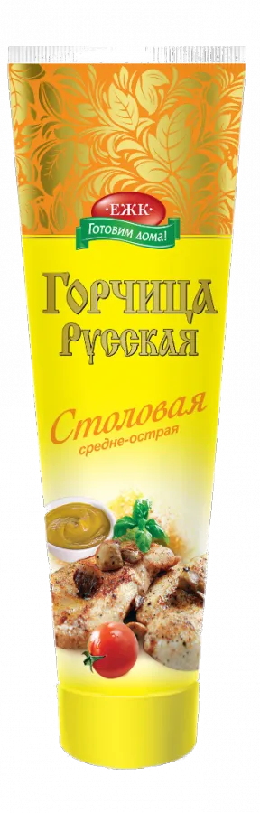 Muștar mediu-ascuțit "EZhK. Gătitul la domiciliu!" Muștarul de masă este fabricat din muștar selectat, completează perfect mâncărurile din carne și pasăre, conferindu-le o aromă picantă și strălucitoare.