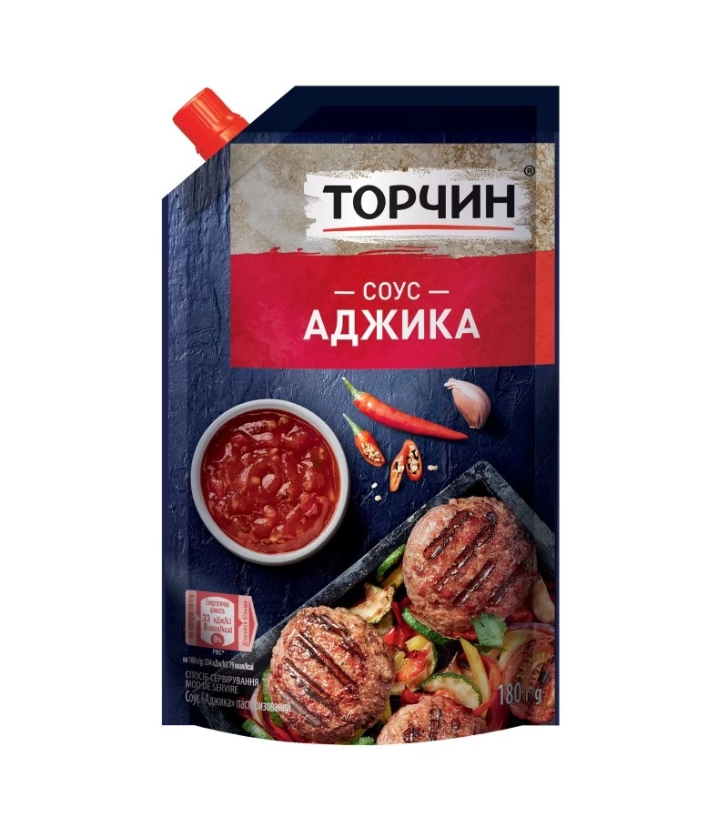 Sosul Adjika de la Torchyn este un sos pe bază de roșii cu un gust pronunțat picant și o textură groasă cu bucăți de paprika și condimente aromate: piper roșu, cuișoare, coriandru, nucșoară.