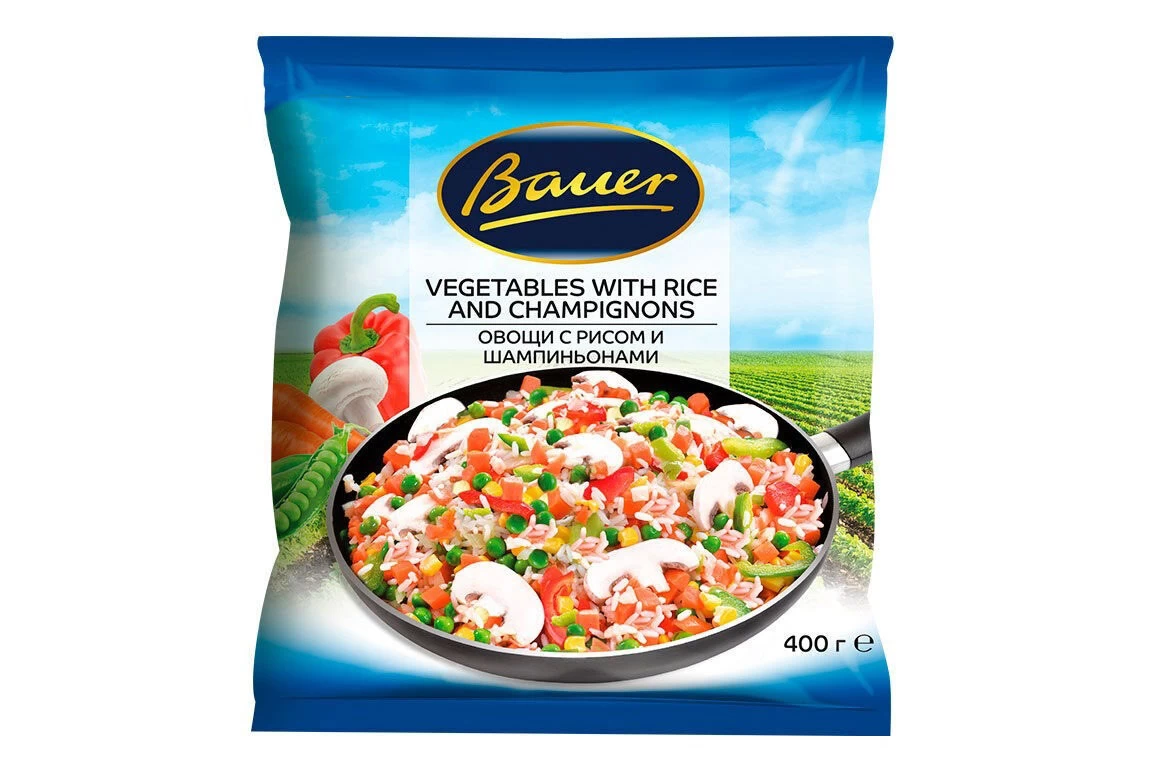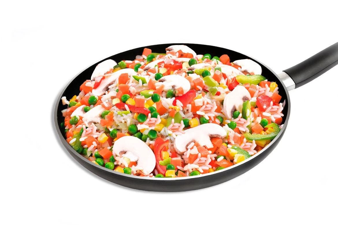Ingrediente: orez, morcovi, ciuperci, ardei roșu, mazăre, porumb, ceapă.