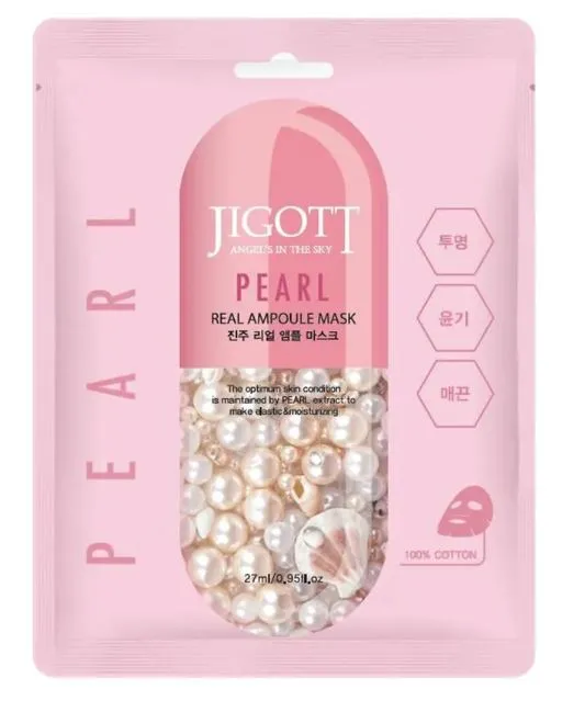 Jigott Pearl Real Ampoule Mask ajută la uniformizarea tenului, precum și la iluminarea petelor de vârstă și a pistruilor. Baza este realizată din bumbac și bogat impregnată cu esență de extract de perle și un complex de nutrienți, care hidratează pielea și o umple cu toate microelementele și vitaminele necesare. Ingredientele active din mască (acid hialuronic, betaină și colagen) hidratează și restaurează.