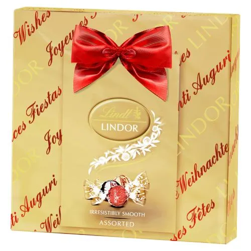 Cutia cu trufe de ciocolată Lindt LINDOR Assorted chocolate truffles împachetată pentru cadou este cadoul perfect pentru sărbători, cu o selecție de bile de ciocolată cu lapte, albă și extra neagră. Cutia cadou ambalată cu rafinament, cu panglică și fundă frumoasă, îi va impresiona cu siguranță pe cei dragi. Maeștrii ciocolatieri Lindt combină expertiza și cele mai bune ingrediente pentru a produce coaja de ciocolată perfect rotundă cu o umplutură irezistibil de fină și fondantă. Din 1845, Lindt s-a dedicat producerii celor mai fine ciocolate, iar rețetele create de Maeștrii Ciocolatieri Lindt sunt de cea mai bună calitate pentru a vă încânta papilele gustative.