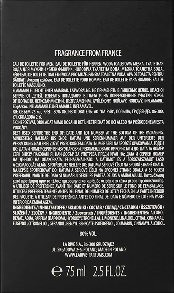 Mirosul nobil al parfumului Black Fury de LA RIVE nu numai că îți încântă simțul olfactiv. Textura misterioasă a parfumului pentru bărbați constă într-o combinație de lămâie, bergamotă, citrice, scorțișoară, trandafir, iasomie și cardamom. Pentru a completa perfect nuanțele fructate ale apei de toaletă, notele finale de bază, precum vanilie, mosc, chihlimbar și lemn de cedru, oferă atingerea finală.