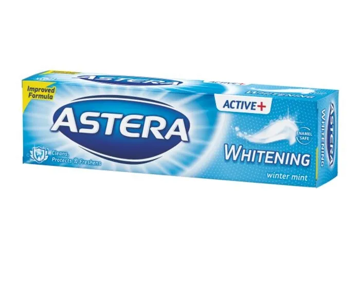 Pasta de dinți de albire de la brandul bulgăresc Astera combină albirea eficientă, prospețimea mentolată și un preț accesibil. Acest produs face față plăcii negre de la cafea, ceai sau produse din tutun. Pasta de dinți are un efect abraziv ușor, astfel încât nu zgârie smalțul dentar și lustruiește suprafața dinților.