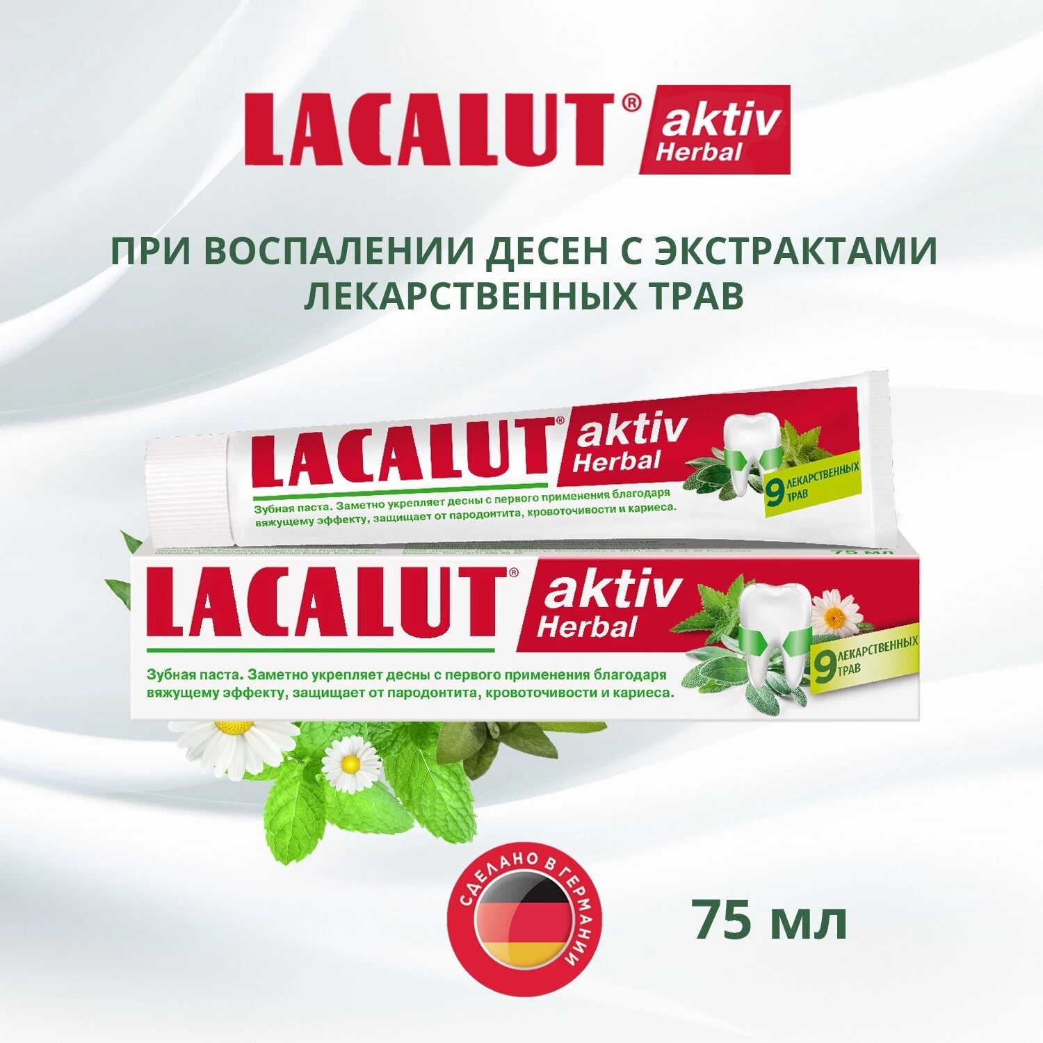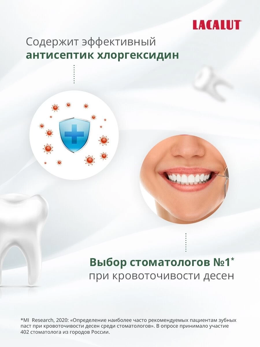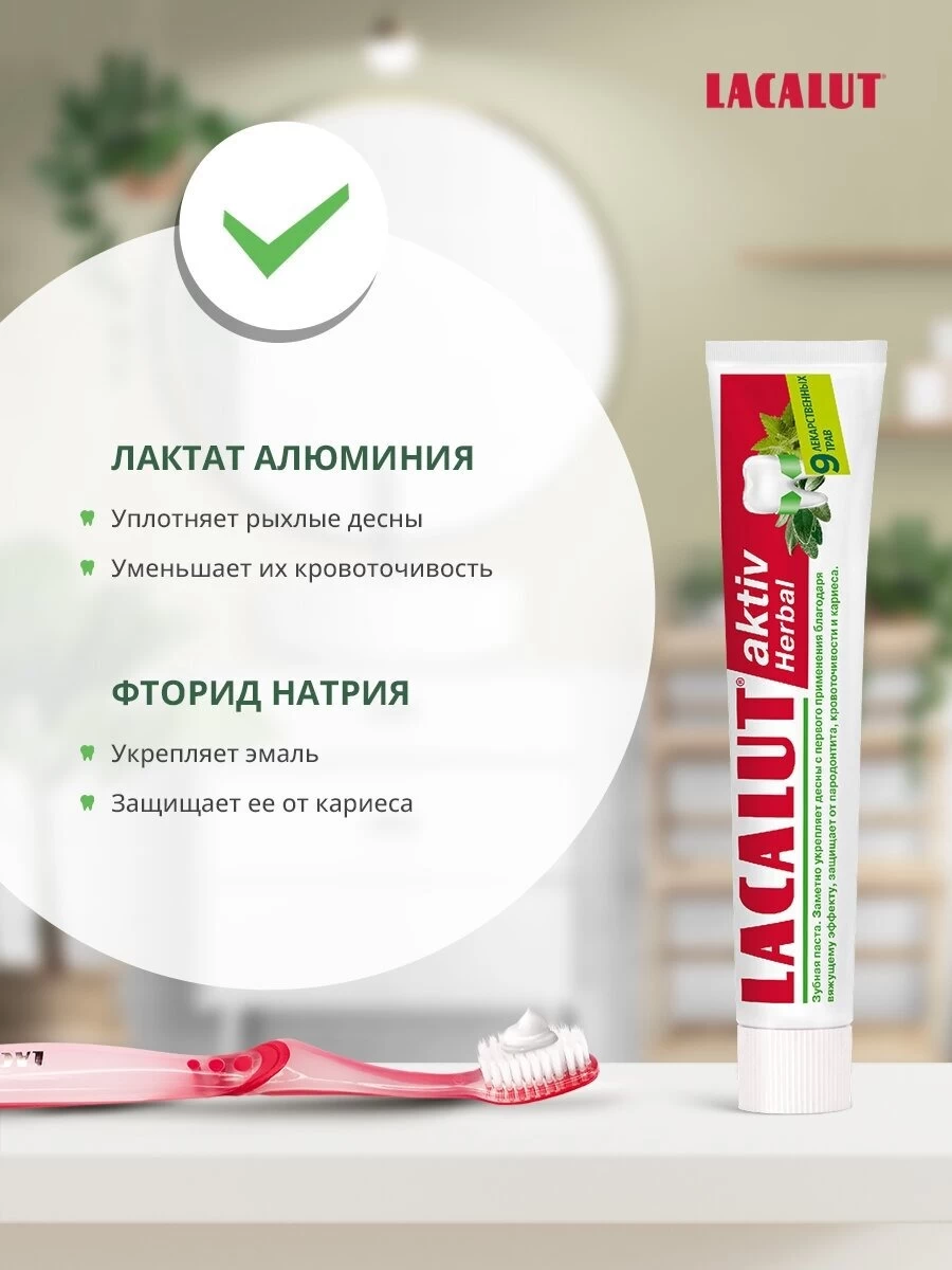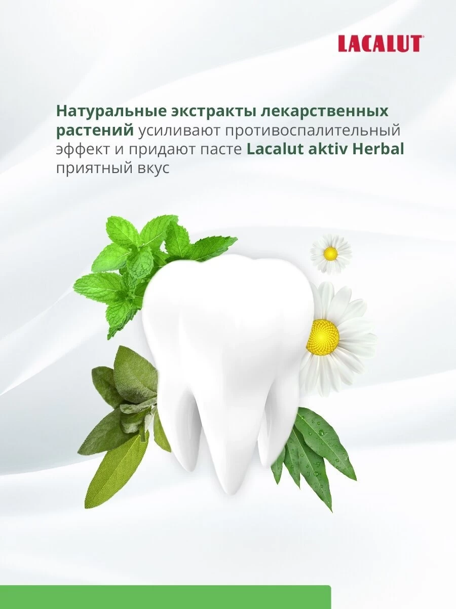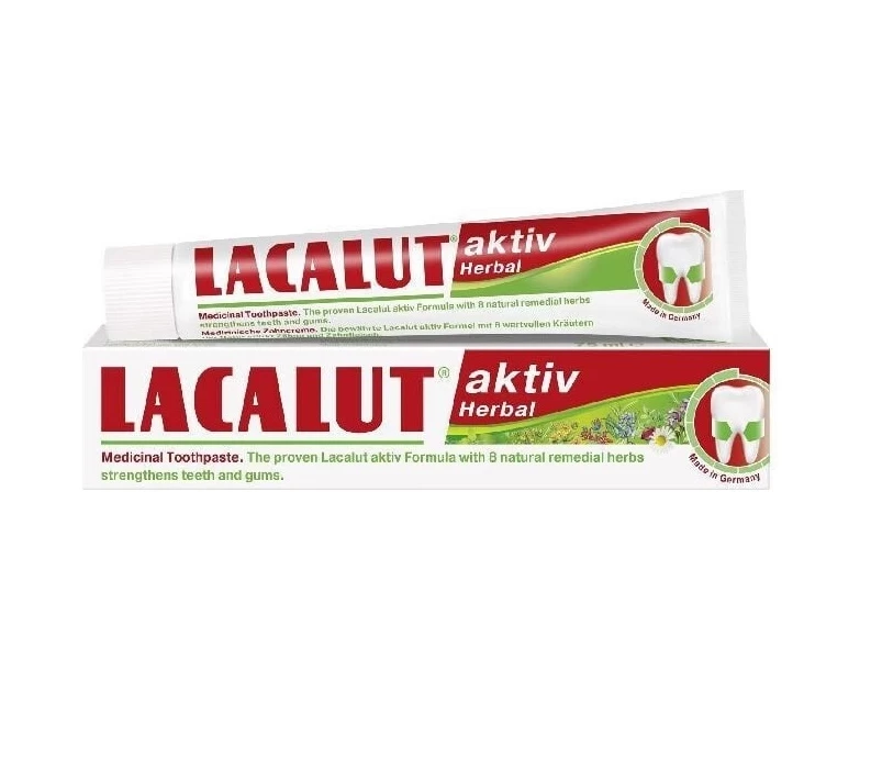 Pasta de dinți pe bază de plante LACALUT aktiv îndepărtează placa bacteriană (agenți aderenți care conțin molecule de clorhexidină), reduce inflamația țesutului gingival și sângerarea (alantoină și bisabolol), are un efect astringent (lactat de aluminiu), întărește structura smalțului dentar și previne apariția cariilor (fluorură de aluminiu).