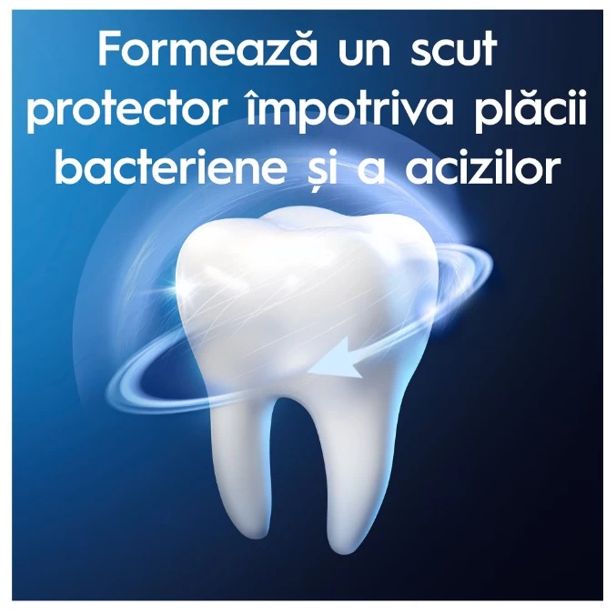 Ofera protectie 24 de ore impotriva placii bacteriene prin periaj de doua ori pe zi. Ofera o senzatie de curatare pentru intreaga gura. Intareste activ dintii prin remineralizarea smaltului. Formeaza un scut protector impotriva placii bacteriene si a acizilor. Dezvoltata impreuna cu medicii dentisti. Pasta de dinti cu o aroma proaspata de menta.