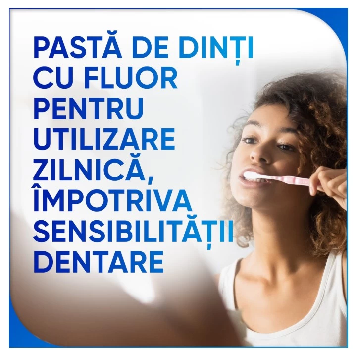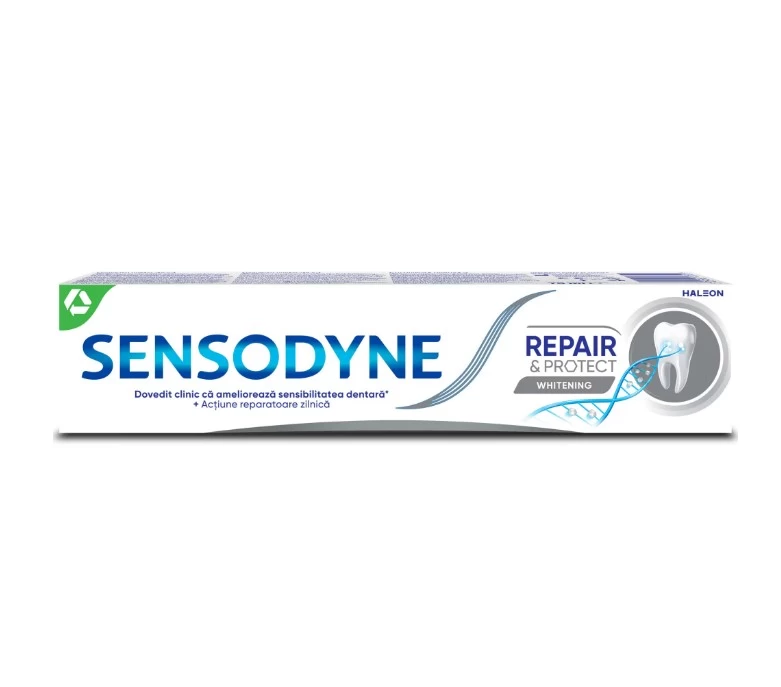 Sensodyne® Repair & Protect Whitening este o pasta de dinti, care poate repara zonele sensibile ale dintilor, ajutand in acelasi timp la redarea albului natural al dintilor. Se bazeaza tehnologia NOVAMIN®, care ajuta la repararea zonelor vulnerabile ale dintilor prin formarea unui strat protector compus din minerale similare celor din structura naturala a dintelui.