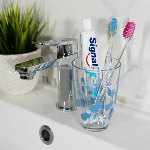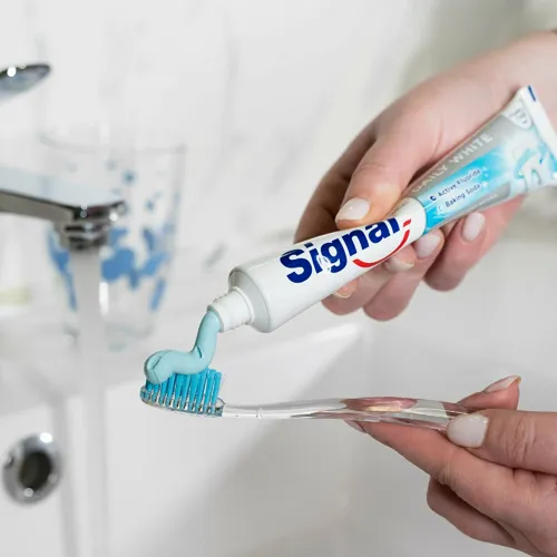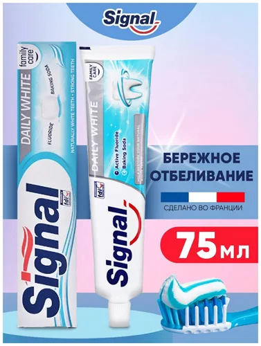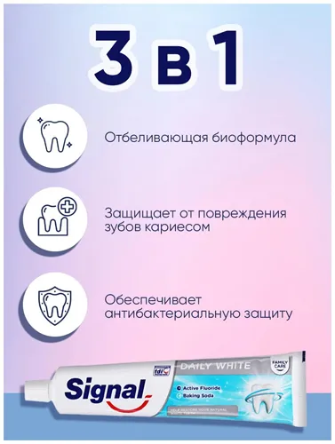 Pastă de dinți de albire, antibacteriană, anti-cavitate pentru dinți și îngrijire orală. Pasta de dinți Signal protejează în mod fiabil dinții împotriva cariilor, îi curăță în profunzime, îndepărtează placa bacteriană, îi albește vizibil și îi împrospătează în mod plăcut.