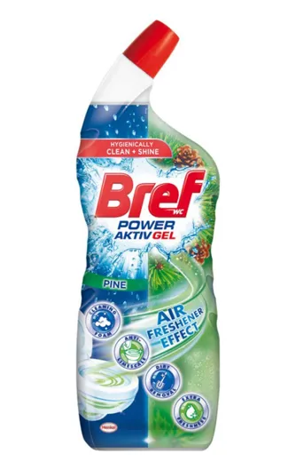 Bref Power Active Gel Pine actioneaza impotriva depunerilor de calcar, lasand vasul de wc stralucitor si improspatat, cu un parfum placut, astfel asigurand o curatare eficienta, fara efort. Acesta are capacitatea de 700 ml, iar consistenta sa (gel) permite aderarea la peretii vasul de toaleta, chiar si in zonele verticale ale acestuia, iar noua forma a sticlei permite o aplicare mai buna a solutiei, fiind potrivita pentru toate tipurile de toaleta si pentru toate suprafetele.
