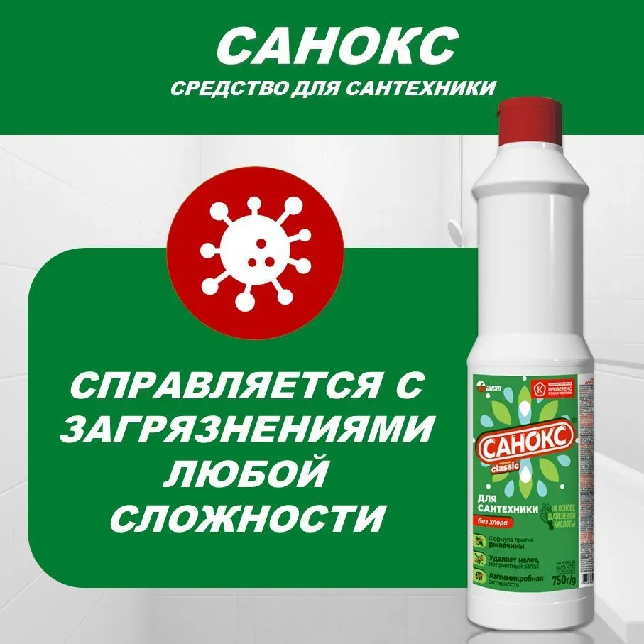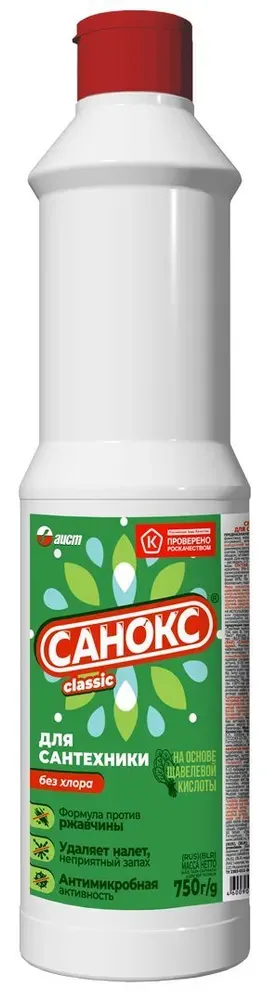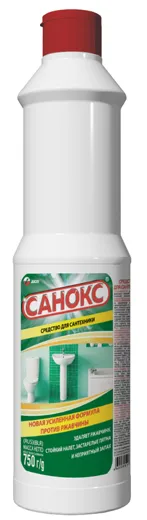 Sanox Sanitary Cleaner îndepărtează fără urmă rugina, spuma de săpun, grăsimea și murdăria adâncă, depunerile vechi de sare și calcar. Nu necesită efort la curățare. Primul detergent lichid din Rusia pe bază de acid oxalic. Îndepărtează perfect rugina, conferă strălucire și luciu suprafeței, distruge microbii dăunători. Datorită calităților excelente de curățare, "Sanoks" este lider pe piața rusă în rândul agenților de curățare pentru obiecte sanitare. Distruge agenții patogeni ai stafilococului și infecțiile intestinale. Conceput pentru curățarea chiuvetelor, toaletelor, gresiei și a altor echipamente sanitare de rugină, depuneri de calcar, grăsime și alți contaminanți. Mod de utilizare: distribuiți uniform produsul pe suprafața contaminată și lăsați-l timp de 5-10 minute, frecați cu un burete sau o perie, apoi clătiți cu apă. Conține acid oxalic. Folosiți mănuși de cauciuc. Nu se recomandă pentru curățarea suprafețelor emailate (cu excepția emailurilor rezistente la acizi).