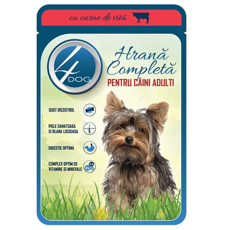 Plic 4Dog Vita 100g - este o hrana umeda completa, cu bucati delicioase de carne de vita in sos, ce asigura nutritia echilibrata tuturor raselor de caini adulti, de orice talie.