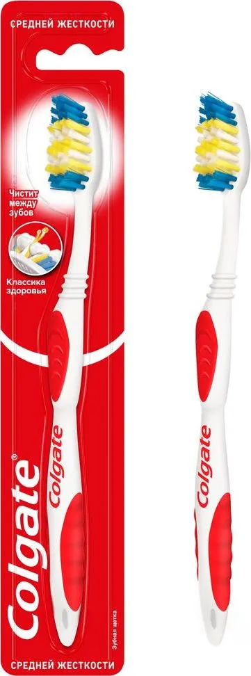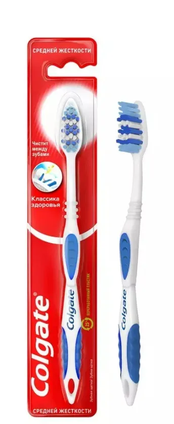 Periuța de dinți multifuncțională Colgate Classic Health, de duritate medie, cu peri multistratificați, îndepărtează particulele de alimente dintre dinți. Dispozitivul de curățare a limbii ajută la îndepărtarea bacteriilor care cauzează respirația urât mirositoare.