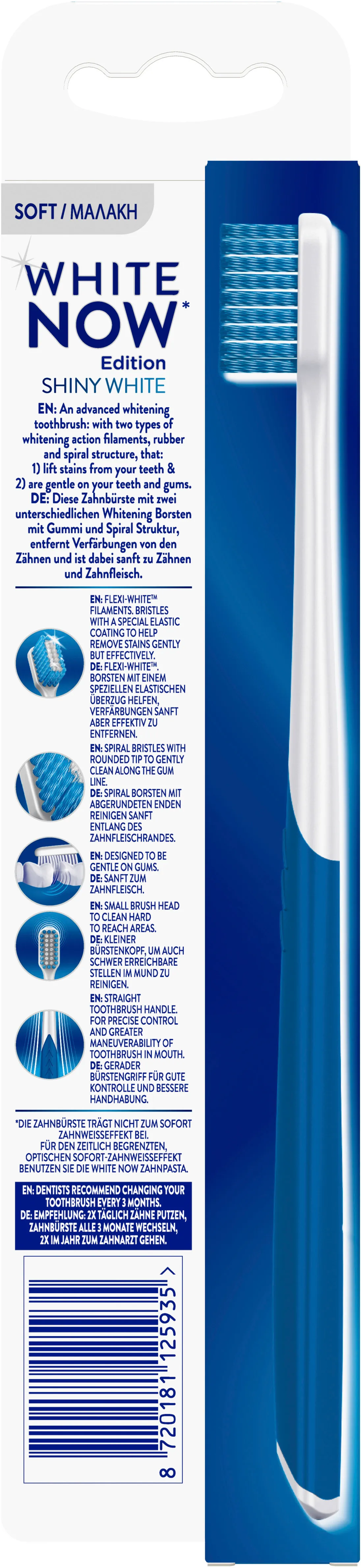 Ușor pentru dinți și gingii. Perii Flexi White. Periile special elasticizate ajută la îndepărtarea delicată, dar eficientă a petelor. Periile spiralate cu vârf rotunjit pentru o curățare delicată de-a lungul liniei gingivale. Cap de perie mic pentru curățarea zonelor greu accesibile. Mâner drept pentru un control precis și o mai mare manevrabilitate a periuței de dinți în gură.