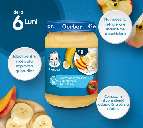 Gerber® Piure de mere, banane și mango cu brânză de vaci, pentru copii de la 6 luni. O compoziție de fructe (mere, banane, mango) cu adaos de brânză cremoasă de vaci. Pasteurizat.