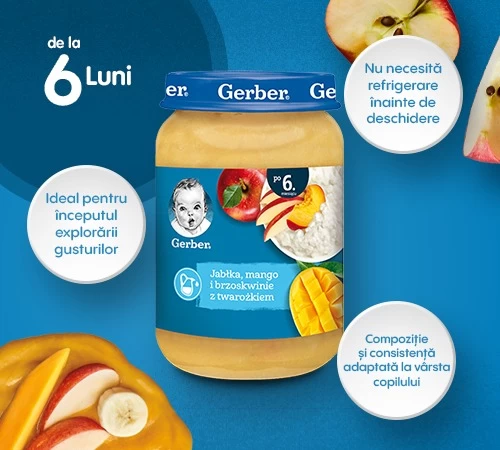 Gerber® Piure de mere, mango și piersici cu brânză de vaci, pentru copii de la 6 luni. O compoziție de fructe (mere, mango, piersici) cu adaos de brânză cremoasă de vaci Pasteurizat.