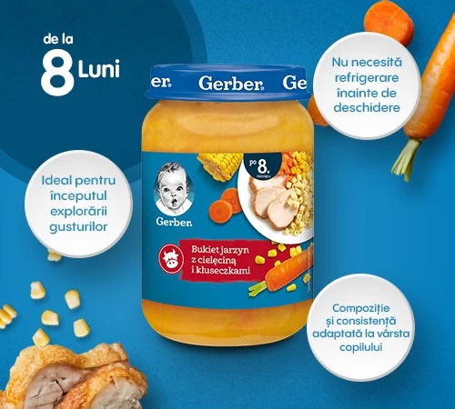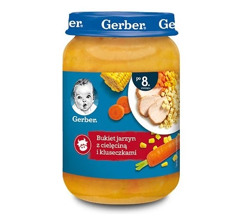 Gerber® Piure de mix de legume cu vițel și paste, pentru copii de la 8 luni. O cină sănătoasă pentru bebelușii cu vârsta peste 8 luni. Conține legume (morcovi, porumb), cartofi, paste și carne de vită. Multitudinea ingredientelor sale promovează acceptarea unei varietăți de arome, iar consistența parțial fragmentată, cu bulgări vizibile, conduce la învățarea mestecării și mușcăturii. Sterilizat.