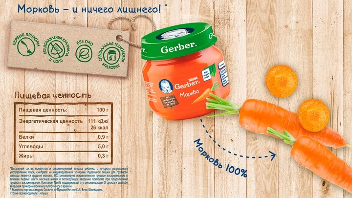 MY FIRST MEAT - Pentru copii începând cu vârsta de 4 luni, în conformitate cu legislația rusă. Țara de fabricație: Polonia Gerber ® piureul de legume într-o singură parte este ideal pentru primul ajutor. Gerber® Piure de legume cu morcovi Gerber® este prima introducere a bebelușului într-o varietate de arome, gătite din legume naturale, bogate în fibre, acizi organici, vitamine și minerale. Consistența delicată îl ajută să învețe să înghită alimente mai groase, iar metoda specială de producție Gerber® păstrează toate beneficiile legumelor naturale în fiecare borcan.
