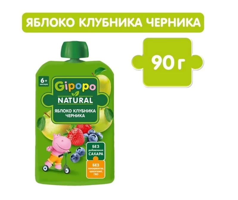 Piure de fructe și fructe de pădure pentru copii GIPOPO într-un pachet convenabil - pungile sunt potrivite pentru hrănirea copiilor de la 6 luni. Piureul de fructe și fructe de pădure GIPOPO „Apple, strawberry, blackberry” conține numai piureuri naturale de fructe și fructe de pădure.
