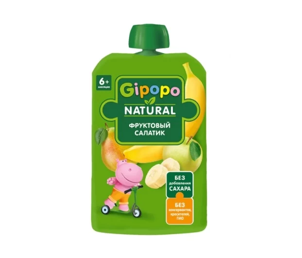 Piure de fructe pentru copii GIPOPO într-un ambalaj convenabil - pungile sunt potrivite pentru hrănirea copiilor de la vârsta de 6 luni.