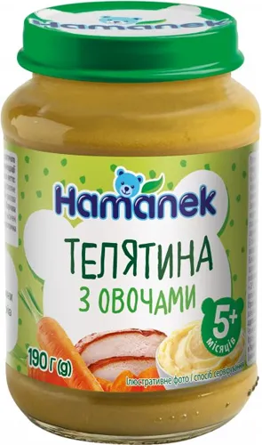 Hamanek Piure multicomponent pentru copii Carnea de vițel cu legume este una dintre cele mai bune alimente pentru copii. Piureurile de carne și legume cu un conținut ridicat de proteine sunt un must-have pentru sugari. Noul meniu va fi pe placul oricărui copil. Aromele luminoase și delicioase ale piureului pentru copii îl vor fascina pe copil de la prima lingură. Calitatea produselor îndeplinește toate cerințele europene.