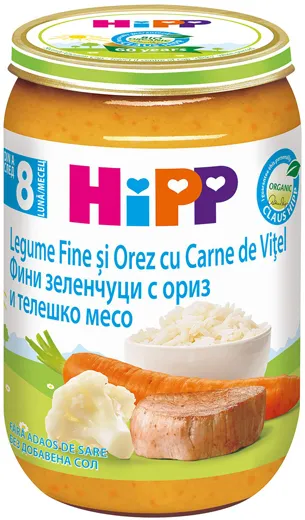 Hrană complementară gata de consum, preparată dintr-o combinație de soiuri valoroase de legume ecologice, orez ecologic și carne ecologică. Îmbogățită cu ulei vegetal și sare iodată.