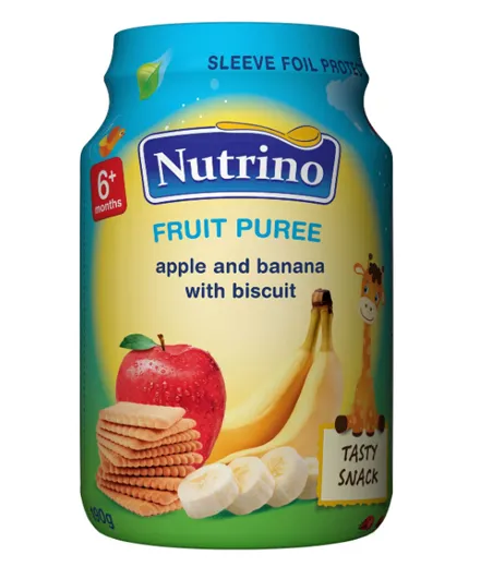 Nutrino piure de fructe cu mere, banane și biscuiți - piure pentru bebeluși și copii mici cu vârsta de peste 6 luni. Pasteurizat. Fără gluten.
