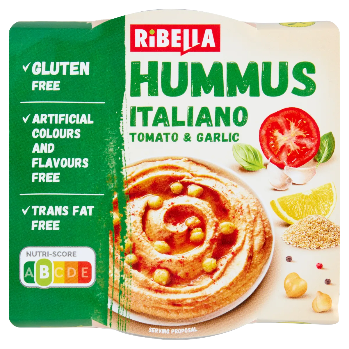 Naut fiert 52%, ulei vegetal (rapita, masline), piure de rosii 12%, pasta de susan, legume (morcovi, ceapa), praf de usturoi 1,5%, condimente si extracte de condimente, sare de bucatarie, regulatori de aciditate: acid citric, bicarbonat de sodiu, zahar 0,3%, conservant: sorbat de potasiu.