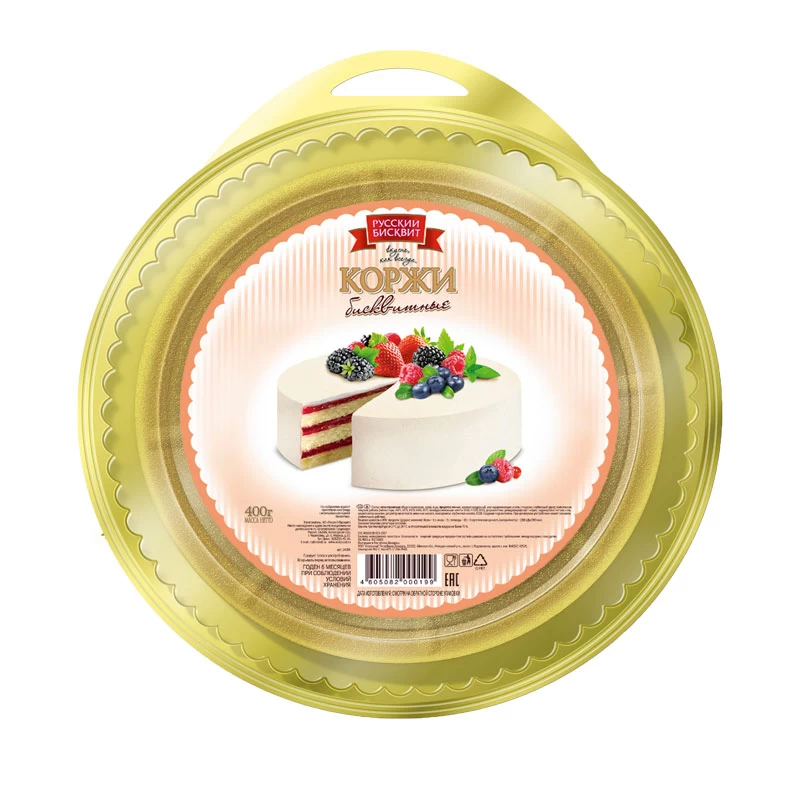 Biscuiți gata preparați pentru a crea torturi și prăjituri după propria rețetă. Biscuiții pufoși au o textură moale, un gust și un aromă plăcute. Se potrivesc cu diferite tipuri de umpluturi. Ambalajul etanș păstrează în mod fiabil prospețimea și proprietățile gustative ale produsului pe toată durata de valabilitate. Ambalajul conține 3 biscuiți.