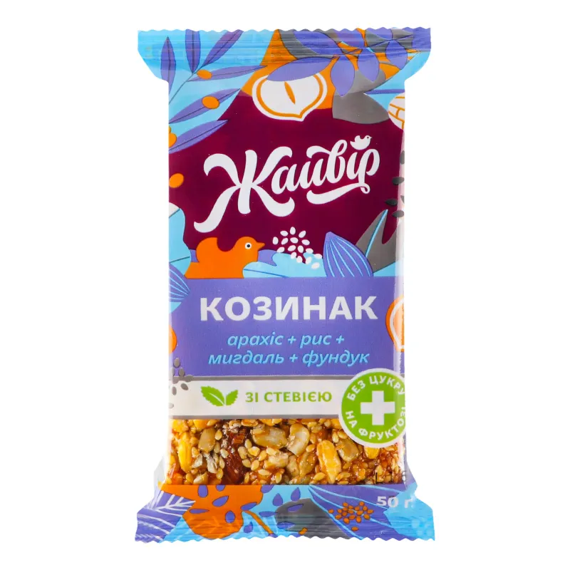 Baton Kozinak Жайвір, cu arahide, orez, migdale și alune de pădure, îndulcit cu stevia și fructoză, fără adaos de zahăr. O gustare crocantă, nutritivă și sănătoasă, perfectă pentru a-ți potoli pofta de dulce într-un mod natural și echilibrat.