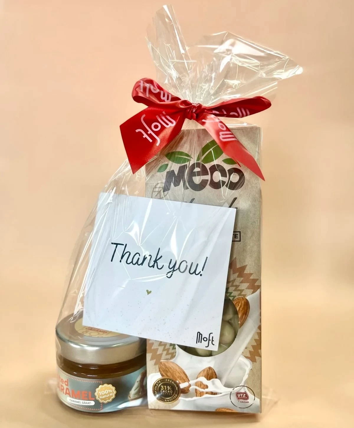 Set inculde: caramel sarat 115g, drajeuri in ciocolata alba Meco, felicitare, ambalaj