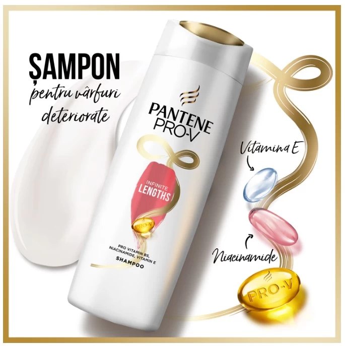 Samponul Pantene Pro-V Infinite Lengths hraneste parul deteriorat mediu si lung pentru a ajuta la intarirea* lui. Repara parul deteriorat de la radacina pana la varfuri, prevenind in acelasi timp despicarea varfurilor, facandu-l sa arate vizibil mai sanatos