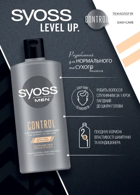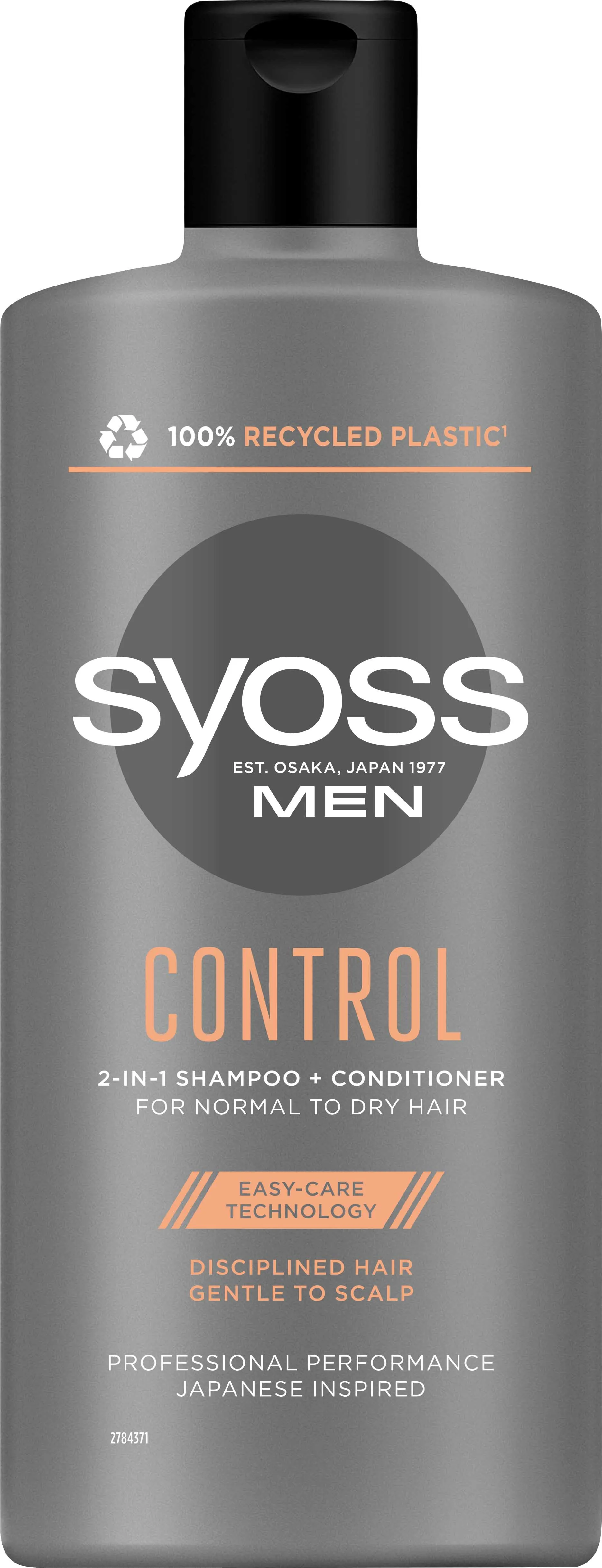 Șamponul și balsamul 2 în 1 SYOSS CONTROL 2 în 1 pentru bărbați pentru păr normal până la uscat face părul mai ușor de aranjat.
