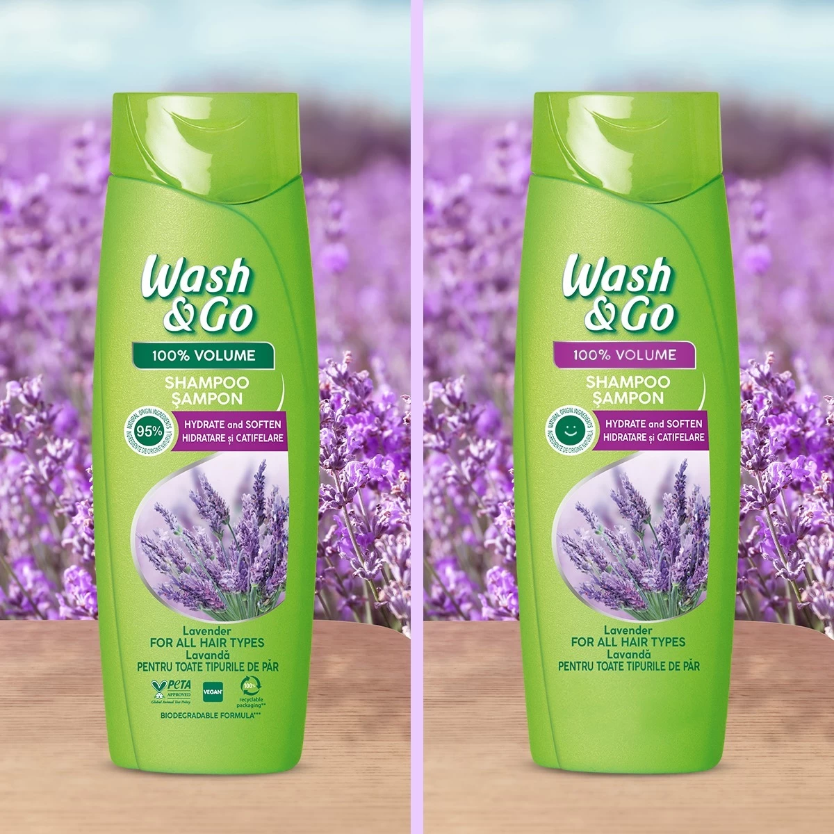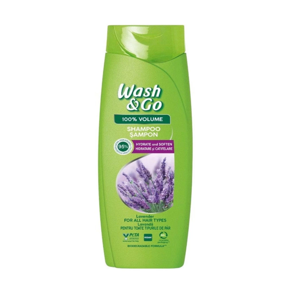Samponul Wash&Go pentru 100% volum contine 95% ingrediente de origine naturala, precum extractul de lavanda.