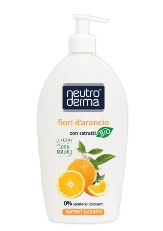 Săpunul lichid Neutroderma cu extracte organice respectă pH-ul fiziologic al pielii și este conceput pentru a curăța delicat mâinile și fața întregii familii. Potrivit chiar și pentru cele mai sensibile tenuri, datorită formulei sale delicate îmbogățite cu extract organic de floare de portocal, care are proprietăți calmante și revitalizante.