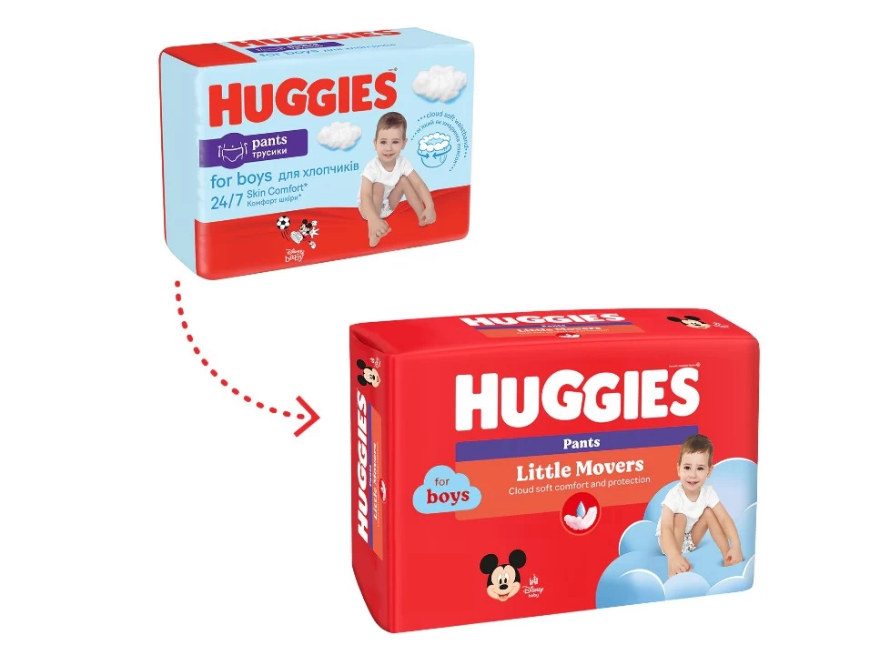 Intr-un nou pachet rosu uimitor, scutecele preferate Huggies® Pants devin acum Huggies® Little Movers – mai moi si cu o protectie si mai buna.