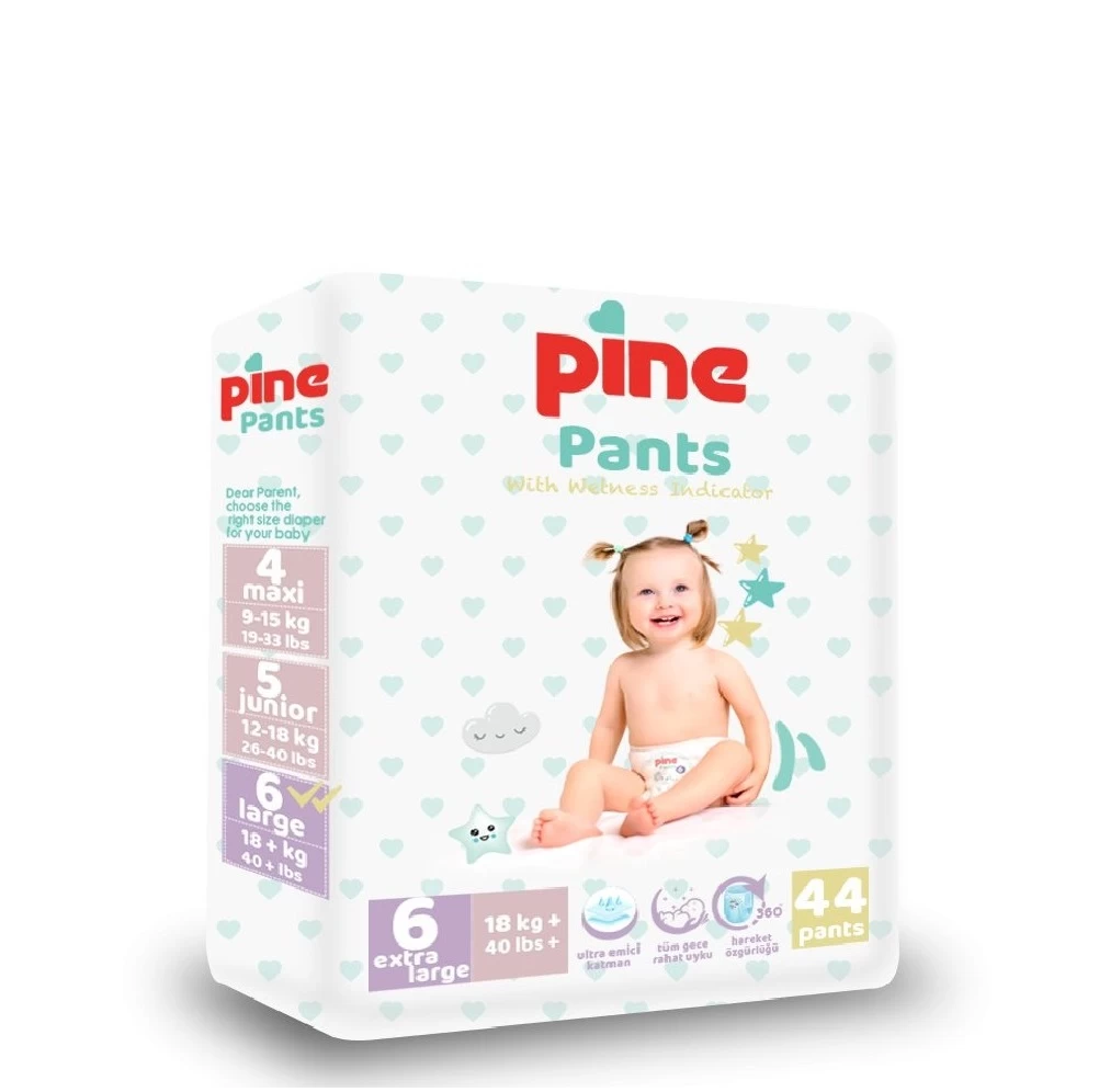 Scutecele Pine Pants – tip chilot sunt prevazute cu un strat interior cu polimer super absorbant si celuloza ce transforma lichidul in gel; margini inalte ce previn scurgerile accidentale, si asigura un mediu uscat pe termen lung.