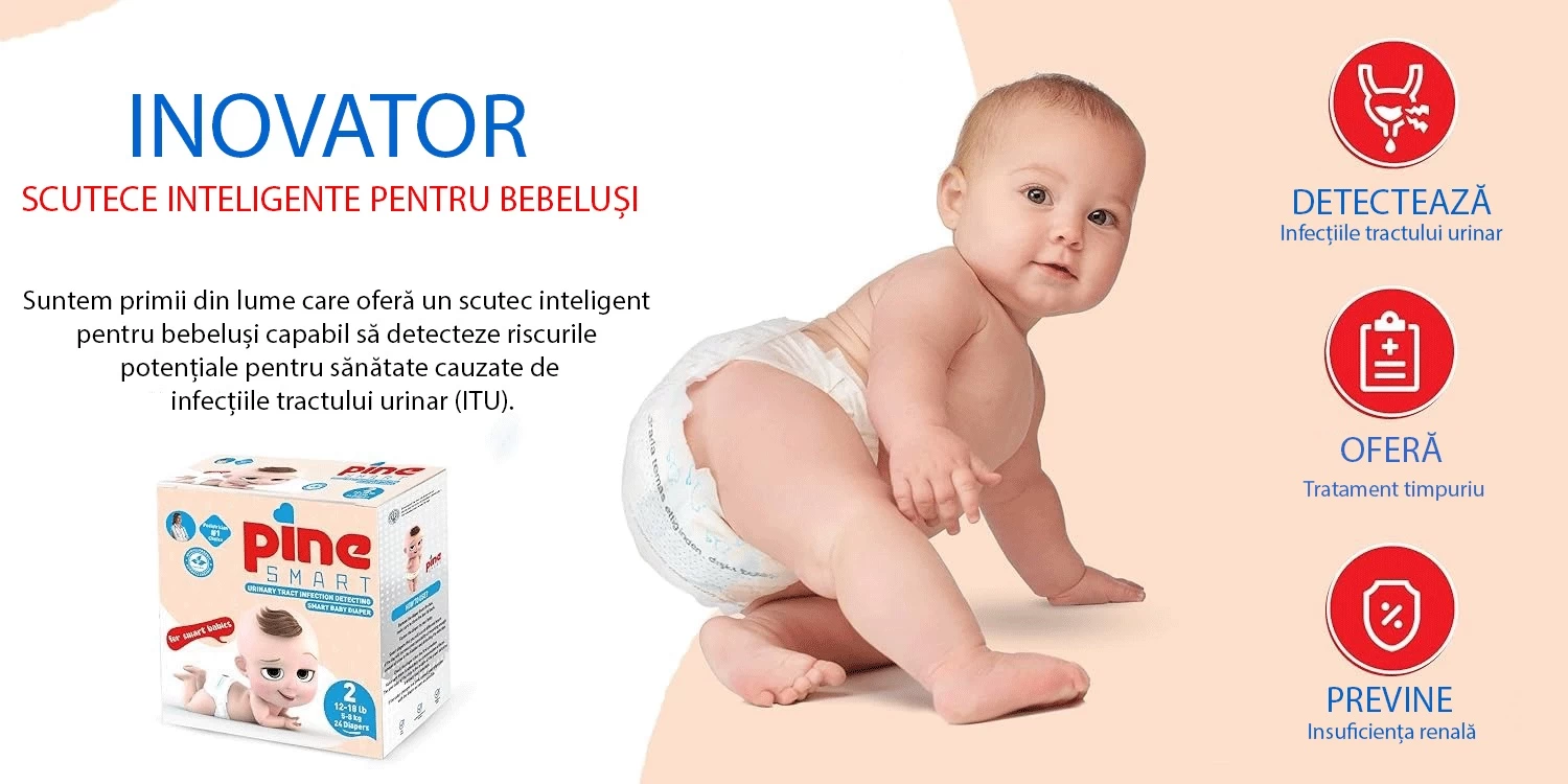Pine Smart este primul și singurul scutec inteligent din lume care detectează prezența infecțiilor bacteriene în tractul urinar. Acest lucru asigură diagnosticarea imediată a infecțiilor tractului urinar și inițierea în timp util a tratamentului. Scutecul Pine Smart detectează rapid, ușor și precis infecțiile tractului urinar cauzate de prezența nitriților în urină. Dacă în urină este prezentă o infecție bacteriană, banda de testare a scutecului devine roz și alertează părinții cu privire la prezența inflamației și la necesitatea de a solicita asistență medicală. Pine Smart beneficiază de protecție internațională prin brevet la nivel mondial.
