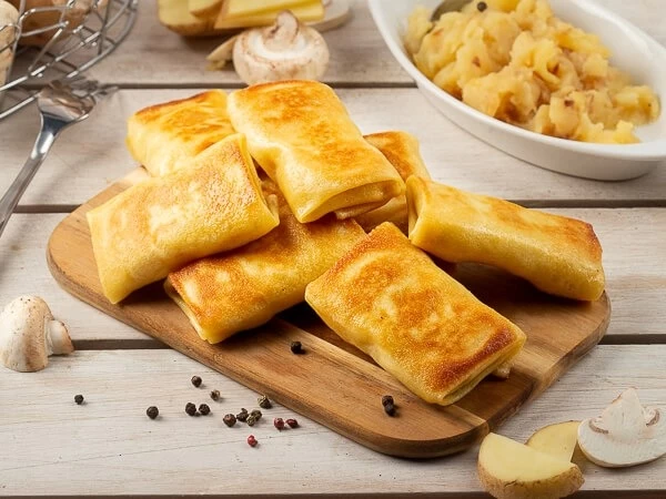 Umplutura: cartofi, ciuperci (champignons), ceapa, ulei de floarea soarelui, sare, amestec de piper