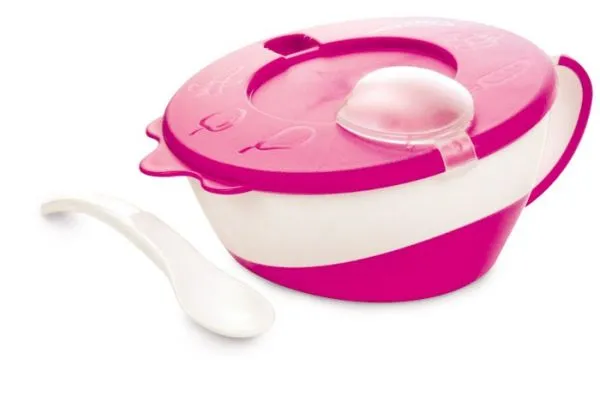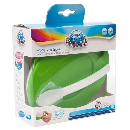 Farfuria de 350 ml. are un mâner special care permite să o țineți într-o mână în timp ce cu cealaltă vă hrăniți copilul. Forma rotunjită a lingurii protejează gingiile sensibile ale bebelușului împotriva deteriorării accidentale în timpul hrănirii. Produsul este indispensabil dacă intenționați să ieșiți la plimbare sau într-o excursie.
