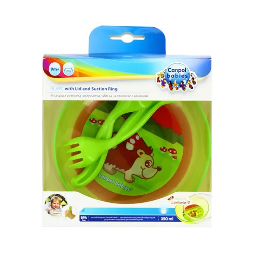 Plăcuță practică, transparentă, cu desene colorate. Furnizată cu o ventuză pentru ca placa să poată fi așezată pe masă (suprafața trebuie să fie curată și netedă). Capacul protejează mâncarea de vărsare și de răcire. Setul include, de asemenea, o lingură și o furculiță în formă. Nu se recomandă utilizarea în cuptorul cu microunde, mașina de spălat vase. Fără bisfenol-A.