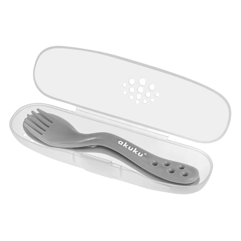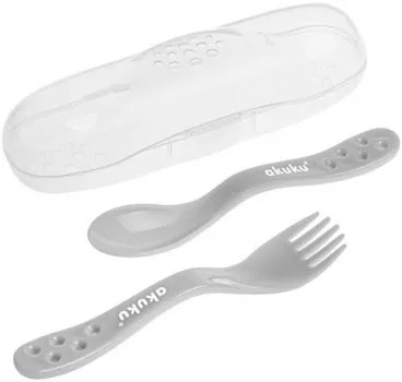 Set de tacâmuri modelate: furculiță și lingură. Echipate cu o husă practică, acestea se vor dovedi în afara casei - la plimbări și pe drum.