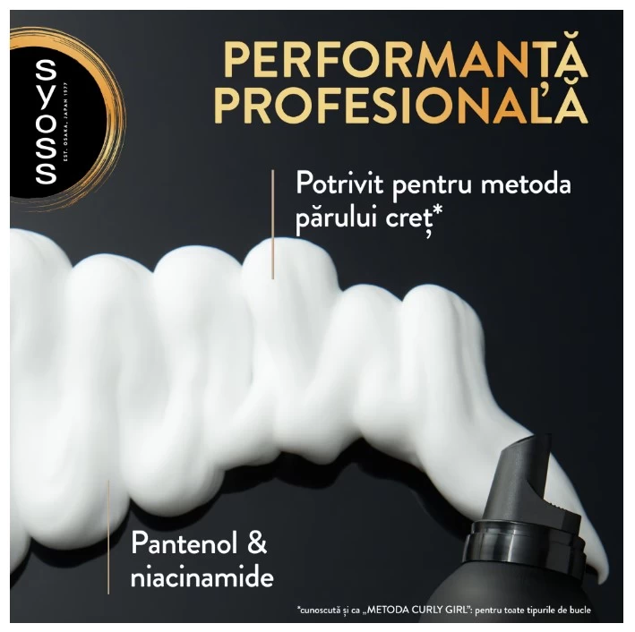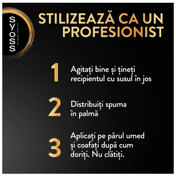 Stilizeaza ca un profesionist: Agita bine si tine recipientul cu capul in jos. Dozeaza spuma in palma si aplica pe parul umed. Modeleaza parul dupa preferinte. Nu se clateste. Pentru un rezultat optim, fixeaza-ti coafura cu fixativul Syoss.