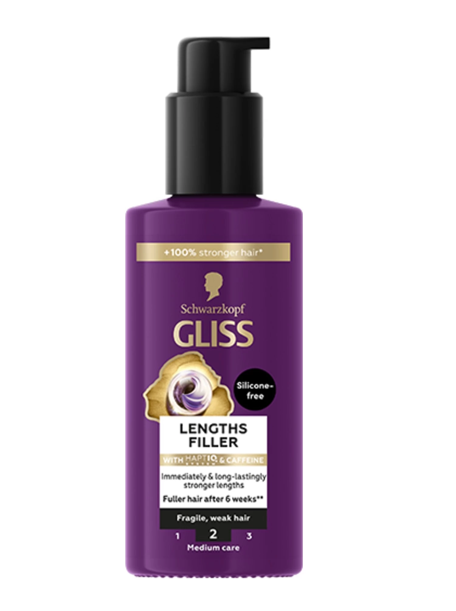 Schwarzkopf Gliss Full Hair Wonder Length Filler 100ml - Un tratament pentru lungimea părului pentru păr fragil și slab. Acest ser pentru lungimea părului Gliss pentru păr slab și fragil combină sistemul Haptiq și cofeina pentru un păr mai plin în 6 săptămâni*. Acesta previne ruperea părului după prima utilizare și întărește lungimea părului.
