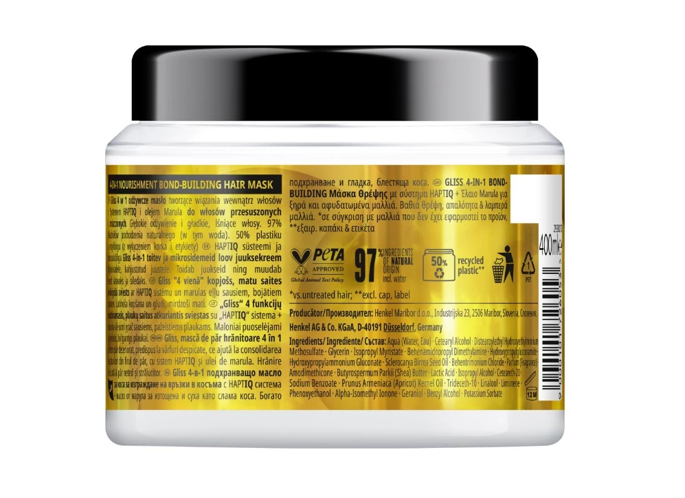 Acest tratament de par Gliss cu sistemul HAPTIQ creeaza microlegaturi si intareste firul de par, reducand deteriorarea acestuia. Pentru rezultate excelente vizibile. Cu un parfum bogat si senzual. 97% din ingrediente sunt de origine naturala.* Produsele pentru par Gliss sunt aprobate de PETA**. Corpul borcanului este fabricat din 50% plastic reciclat***.