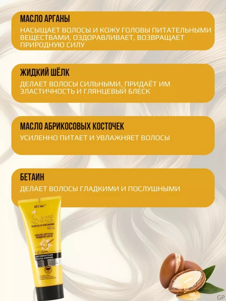 Formula bogată a măștii este special concepută pentru a restabili părul slăbit și deteriorat. Uleiul luxos de argan și uleiul din sâmburi de caise hrănesc și hidratează intens părul și scalpul, întăresc structura zonelor deteriorate, revitalizând părul pe toată lungimea sa. Moleculele de mătase lichidă și balsamul natural betaine fac părul neted, puternic, manevrabil, îi conferă elasticitate și strălucire lucioasă.