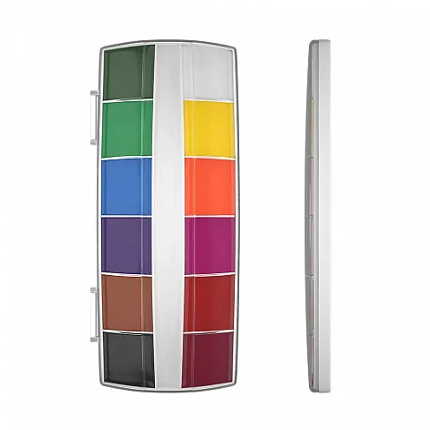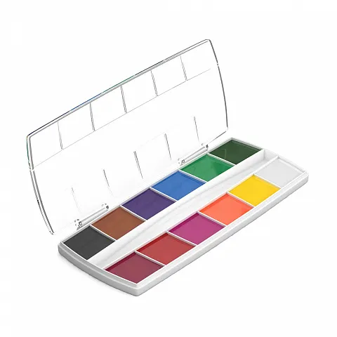 Designul trusei permite plierea capacului sub cuvete, iar acesta poate fi îndepărtat cu ușurință și utilizat ca paletă pentru amestecarea culorilor.