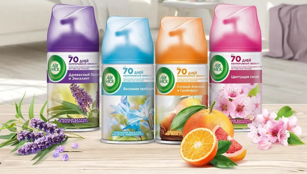 Главный продукт в ассортименте компании – освежители воздуха. Они представлены в двух форматах: аэрозоли и автоматические модели. Компания также выпускает ароматизированные свечи и гели. Все товары Airwick с легкостью нейтрализуют неприятные запахи и взамен наполняют помещение насыщенным ароматом. Их палитра достаточно широка для того, чтобы каждый клиент подобрал для себя соответствующий аромат: цветочный, фруктовый, цитрусовый и другие. Компактный размер освежителей позволяет расположить их в любой удобной части комнаты: поставить на полку, повесить на стену или убрать в шкаф.