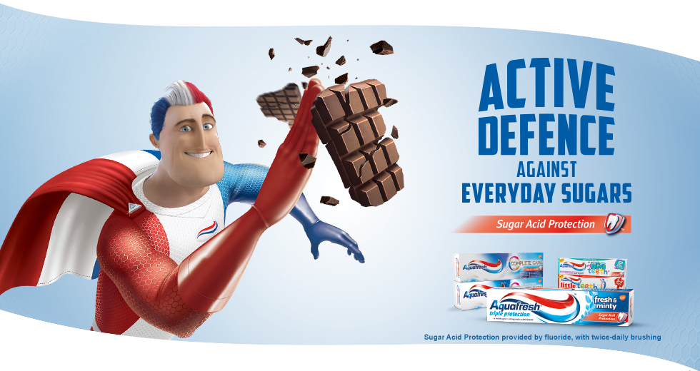 Сахарные кислоты и скрытые сахара не сравнятся с силой Aquafresh®. Сахарная кислота играет важную роль в развитии кариеса. Когда речь идет о защите вашей улыбки от сахарной кислоты и скрытых сахаров, вы можете рассчитывать на Aquafresh®, который обеспечивает активную защиту при регулярной чистке зубов.